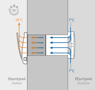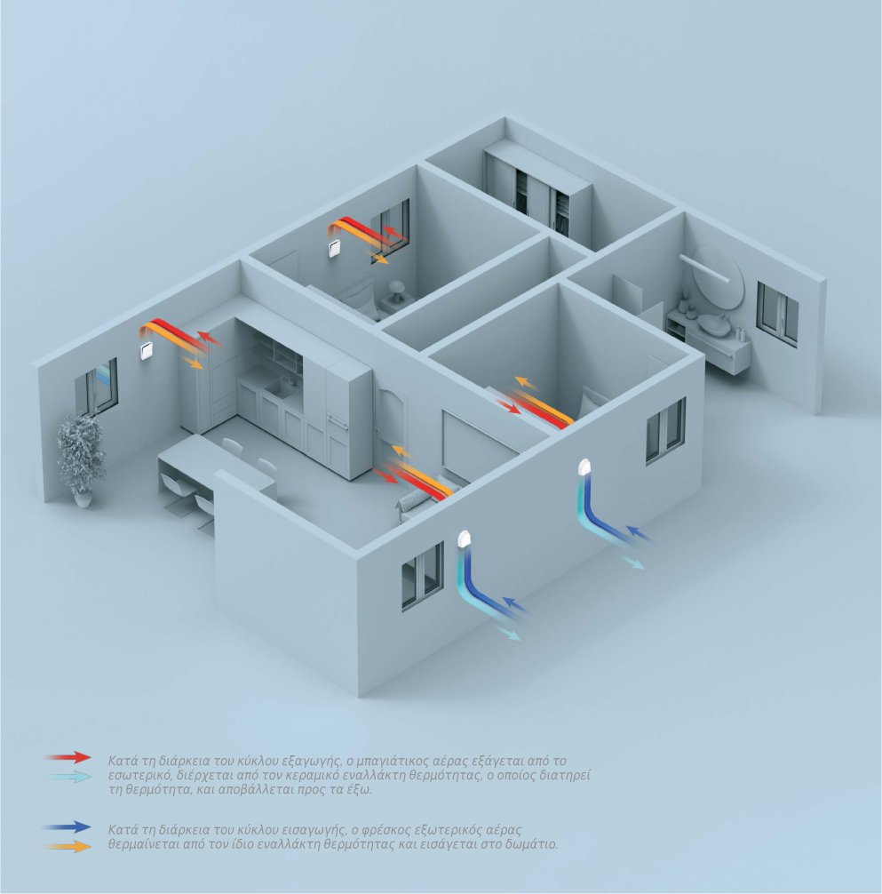 Αυτή η διαδικασία, που επαναλαμβάνεται συνεχώς, εξασφαλίζει καθαρό, υγιεινό αέρα διατηρώντας παράλληλα τη θερμική άνεση χωρίς απώλειες ενέργειας.