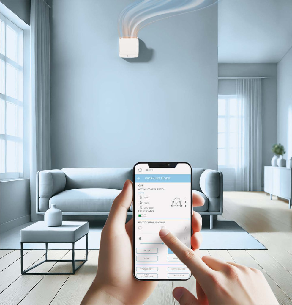 Με ένα απλό και εύχρηστο περιβάλλον εργασίας, το O.app σάς επιτρέπει να παρακολουθείτε και να διαχειρίζεστε τις συσκευές σας VMC από οπουδήποτε. Ξεκινώντας από την αυτόματη λειτουργία, η οποία βελτιστοποιεί την εναλλαγή αέρα χάρη στους αισθητήρες, έως τη νυχτερινή λειτουργία, σχεδιασμένη να εγγυάται μέγιστη ησυχία κατά τη διάρκεια του ύπνου, κάθε λεπτομέρεια έχει σχεδιαστεί για να βελτιώνει την οικιακή ευεξία.